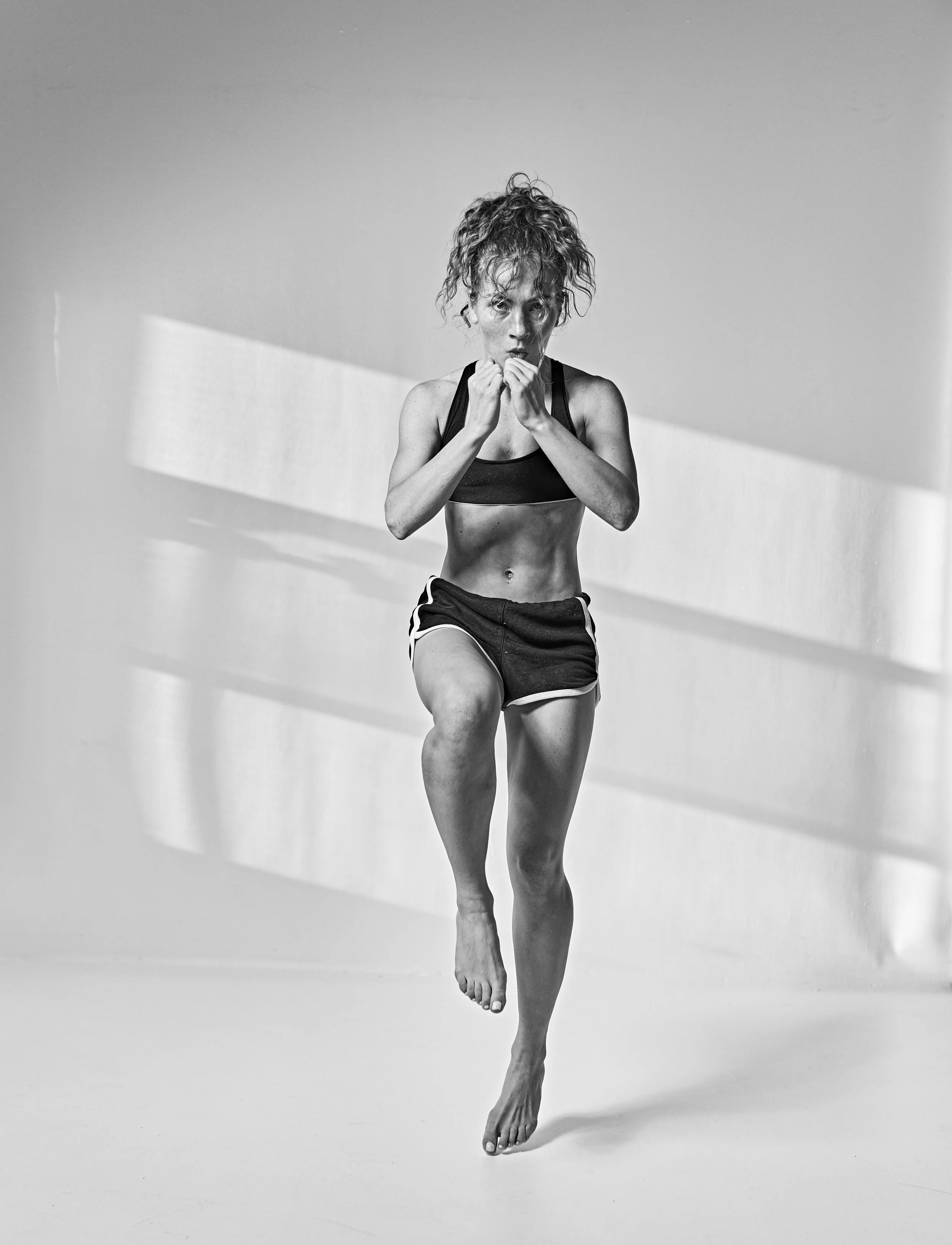 Black and white photo of a fit woman with curly hair, dressed in a sports bra and shorts, mid-jump with fists near her face, in a minimalist studio setting.